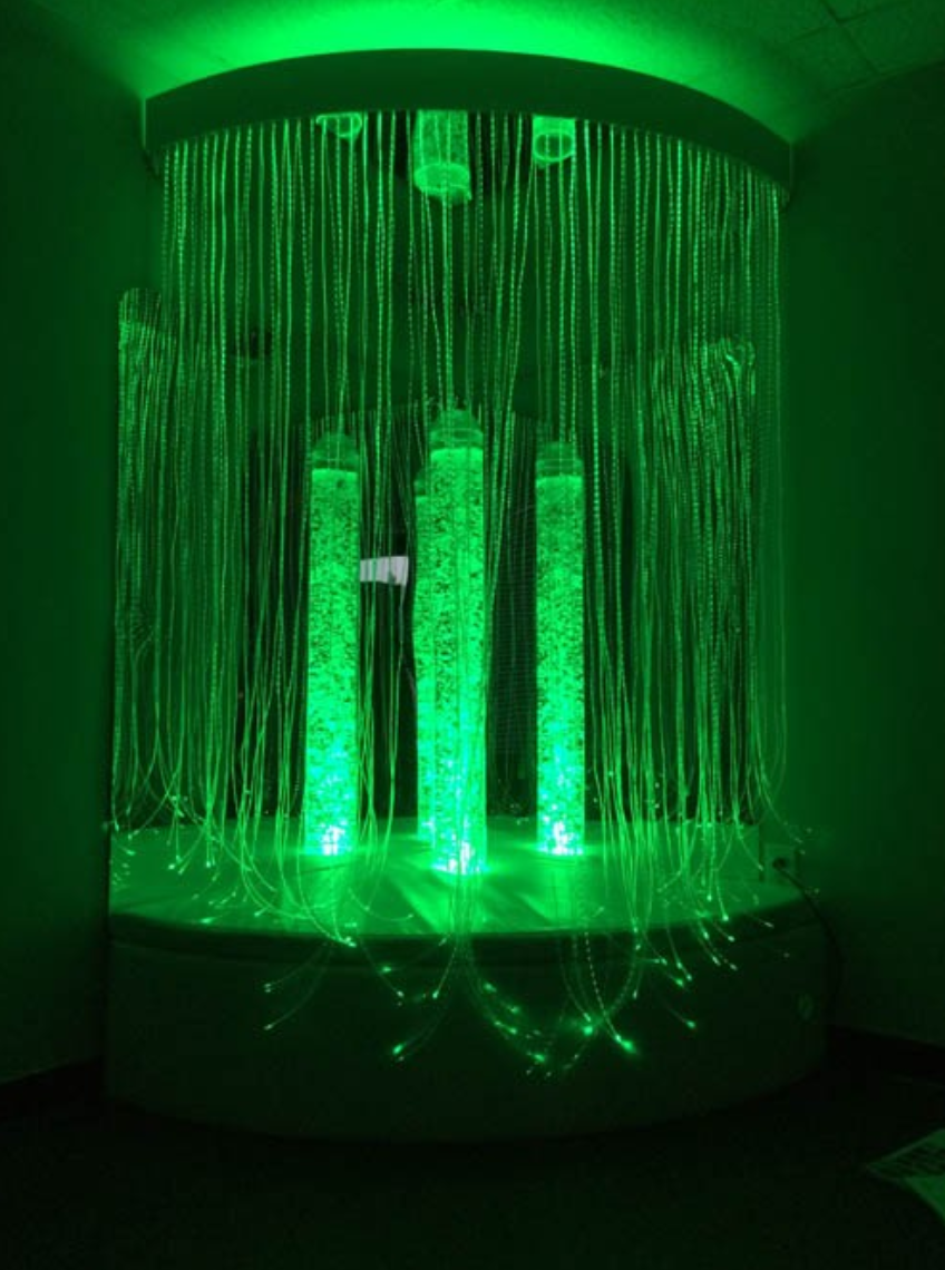 A sensory room is a specially designed room that stimulates sight, touch, taste, smell, sound, and movement senses. By stimulating the senses, the development of thought, intelligence, and social skills are encouraged. Equipment such as bubble columns, projectors casting images, colored optic fibers to touch and see, sound, aroma distributors, vibrating furniture, and equipment switches for interaction can be used to create the multisensory environment that engages and calms those who enter.