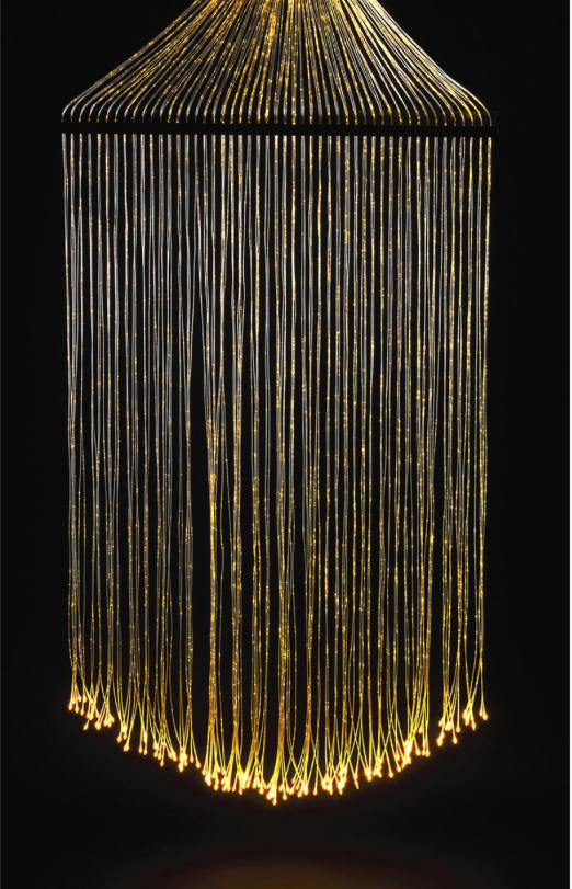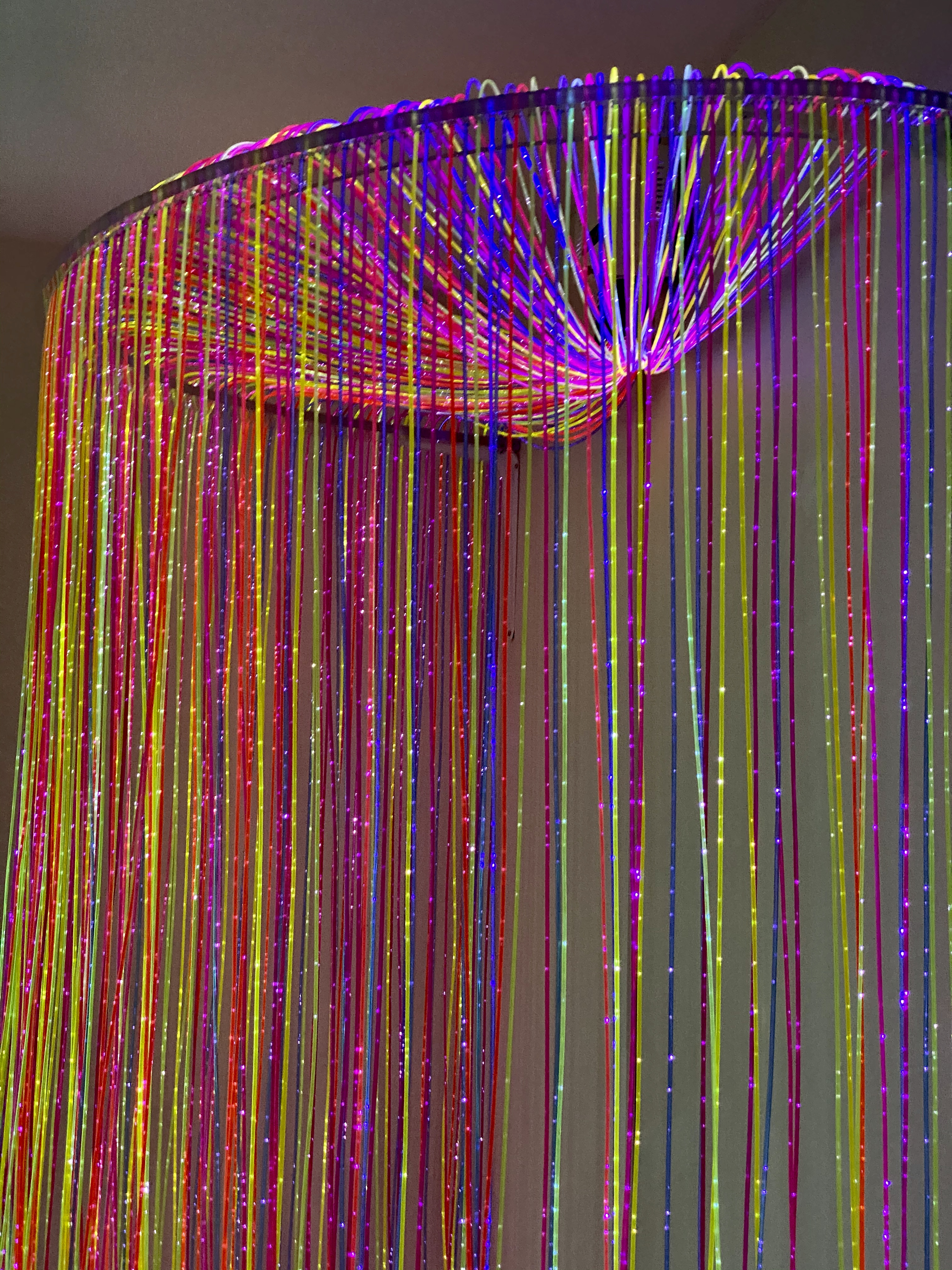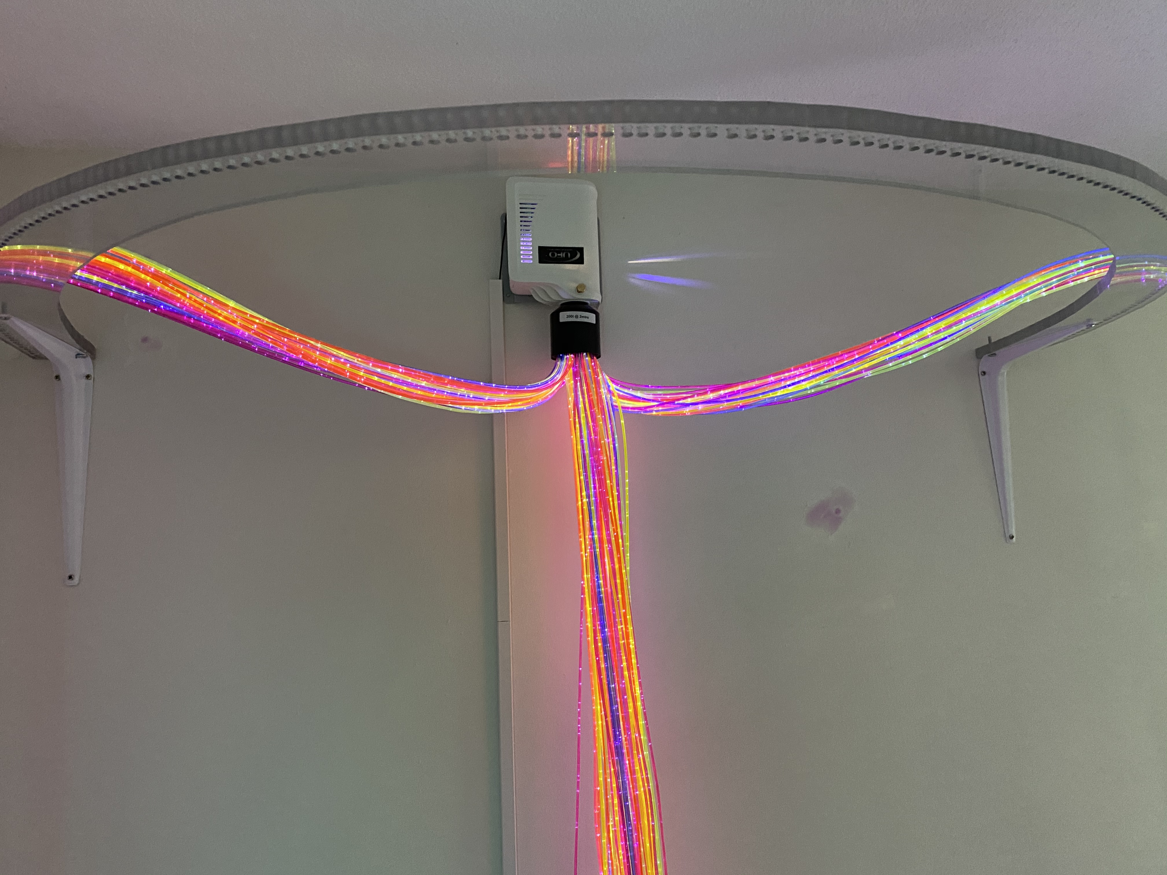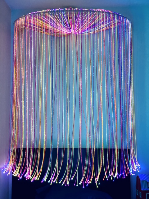 - Using a cascading fiber optic chandelier, the user has the benefit of immersing themselves under the strands by laying on soft-play or a bean bag or in our case, a bed frame!
