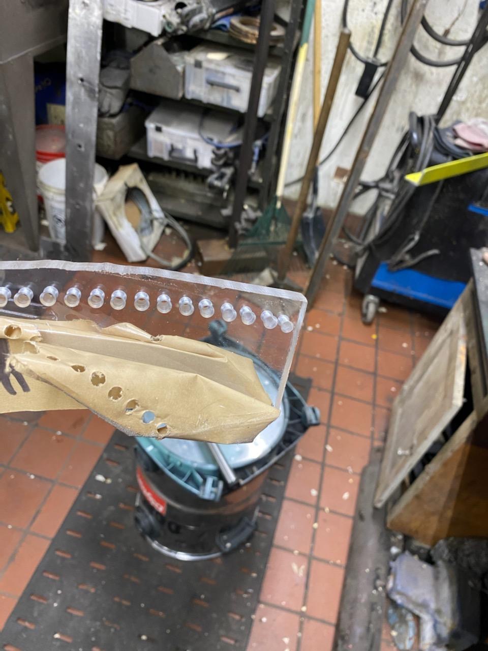 Given the fact that we had to drill 200 holes (!!!!), we took the dimensions of the arc (which was close to 75.5″ in its circumference), we then divided it by 200 and reached the conclusion that there would be 3/8″ inch between each hole. Given that the fiber optic strands were 4mm in diameter, we deduced that each hole would be 3/16″ diameter for each strand. Using the polyethylene tubing again, we traced where the center line for the holes would be placed knowing that we didn’t want the shelf brackets we would use to block the fiber optics. We then used a compass to mark lines at each drill point – we both worked from each end to meet in the middle.