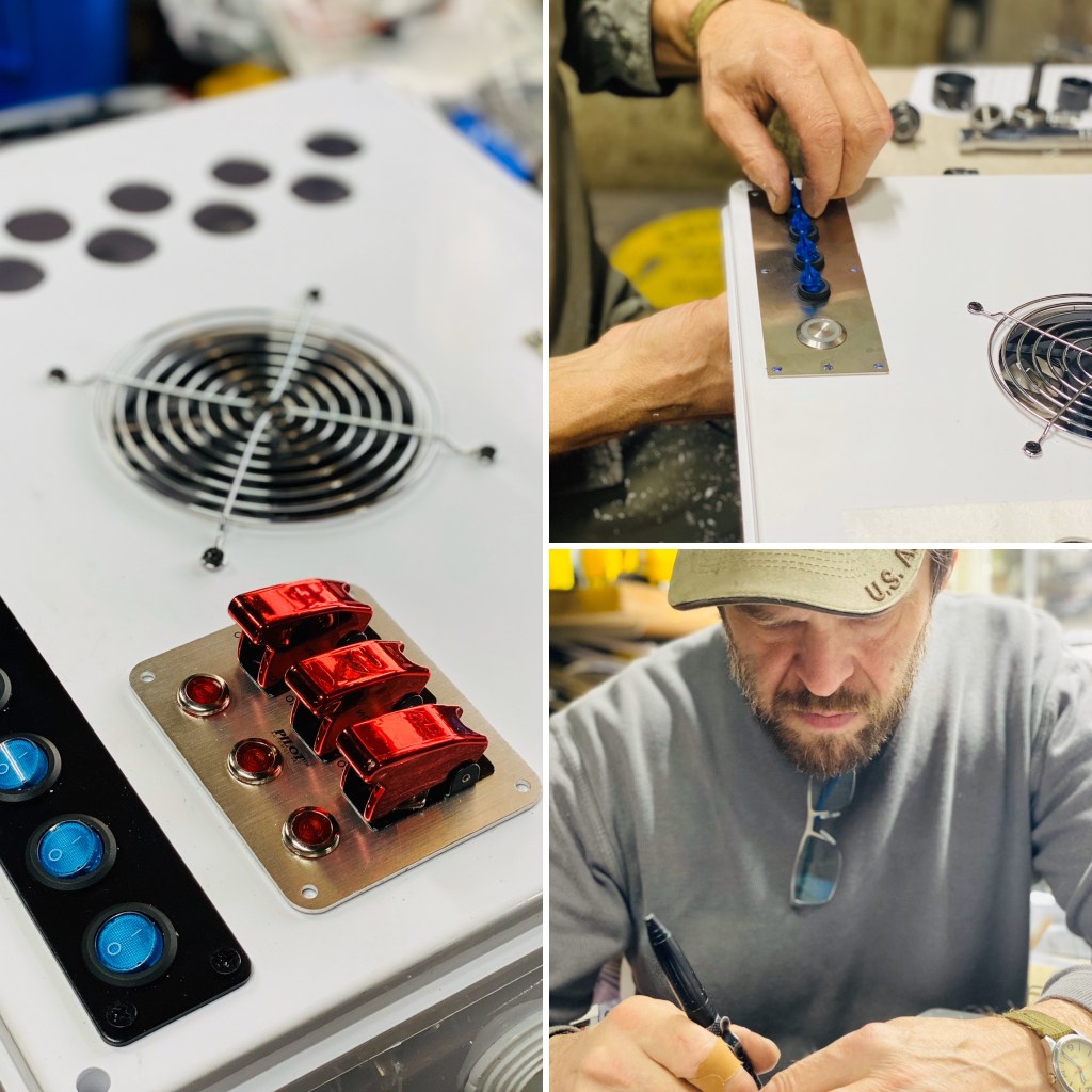 If you layout your switches, be sure you have clearance since there are nuts on the backs of the buttons. This way you don’t overlap spaces and it keeps the wires away from fan opening. Make sure the grill you choose allows for enough air flow to the box. A mistake we first made using a fine mesh grill instead of a more standard computer fan grill.