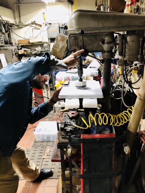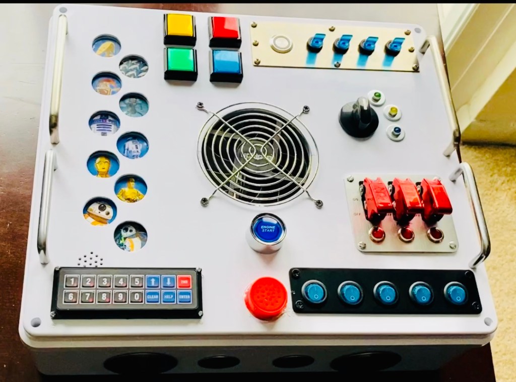 Rotary switch – be careful purchasing this as some of them are stacked contactors (the box may not have enough depth to hold them). So the rotary controls a few small indicator lights. We put a washer behind them to make them look more fancy. It also added a little more strength and support from being pushed in by Tristan.