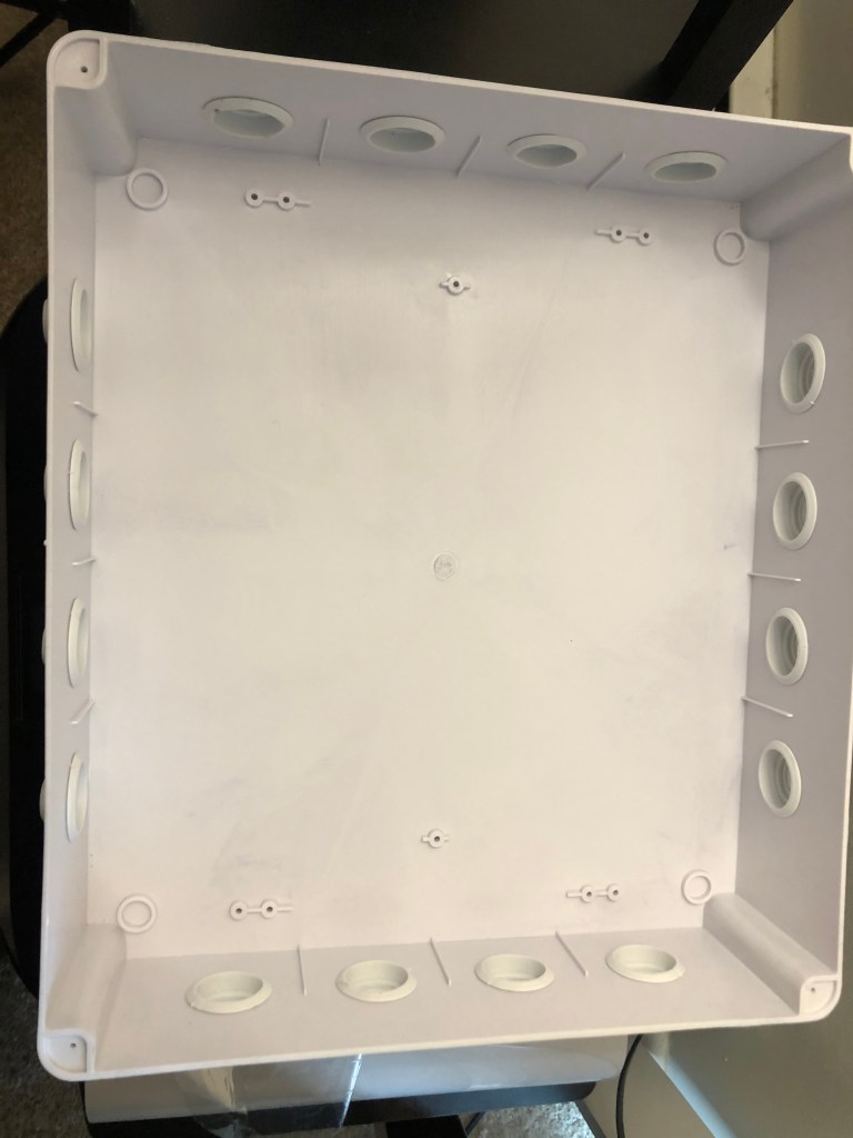 We put 8 snap in hole plugs (about 1 inch in size) over the punch-outs the electrical box already came with. The reason we did this is because the rubber caps that came with the box could easily come out and expose all the wiring to a very curious Tristan. Then we expanded the holes for 8 of the pre-cut punch-outs in the box on the sides and put 8 air vent holes to increase the air flow for the fan.