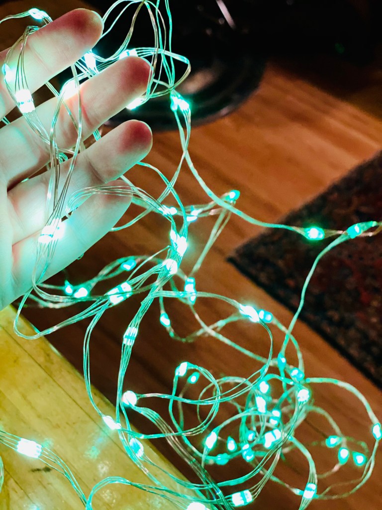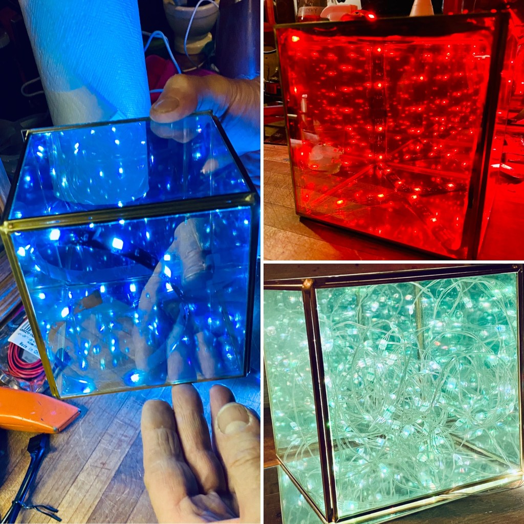 After letting the mirrored film dry and then stick to the surface of the cube, you can begin configuring your LED lights. For one of the projects, I just wanted LED fairy lights in a giant bunch stuffed into the cube so that was easy. Be sure to get plastic coated ones however as the edges of this cube are brass so if an unprotected LED strip touches the brass, it will automatically short circuit the lights (oops!). That infinity cube is fairly simple and then when you add a piece of mirrored glass or mirrored acrylic under it, magic!